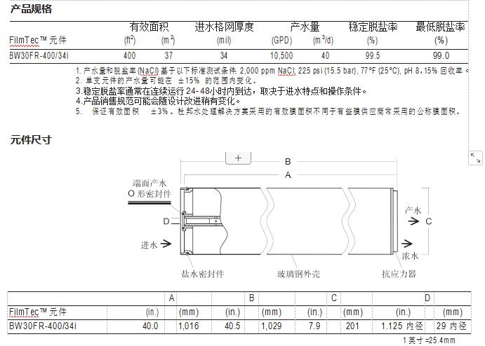 • 34mil 的進(jìn)水流道,降低了膜元件被污堵的幾率,并明顯提 高了膜元件的清洗效果