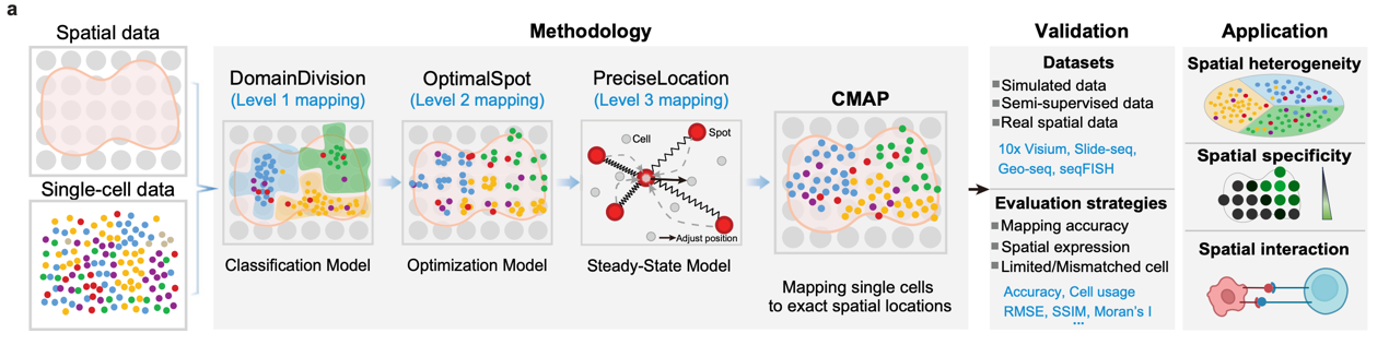 針對這一問題,研究團隊提出了CMAP(Cellular Mapping of Attributes with Position)計算模型,通過整合單細胞和空間轉(zhuǎn)錄組數(shù)據(jù),采用“分治”策略,實現(xiàn)大規(guī)模單細胞向空間位置的高精度映射。