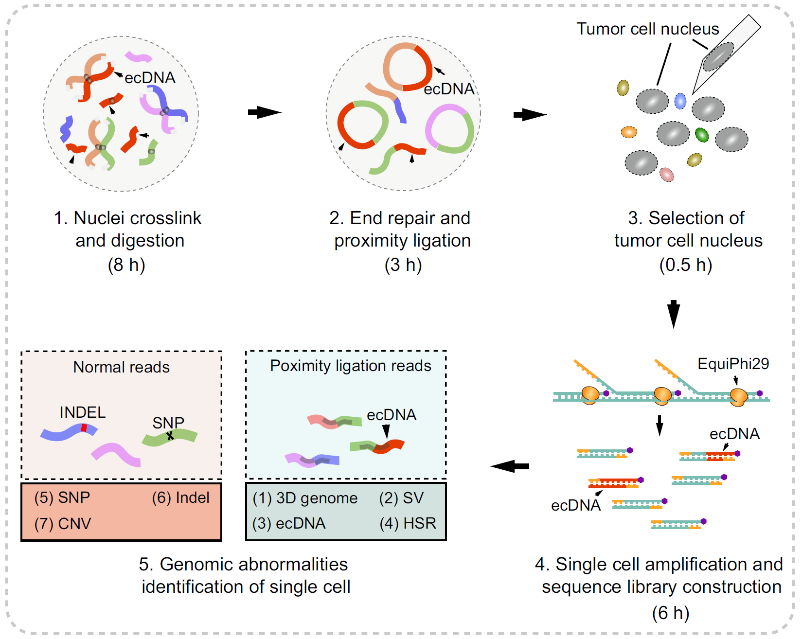 近日,中國科學(xué)院廣州生物醫(yī)藥與健康研究院譜系基因組多維技術(shù)研究組林達(dá)研究員在Nature Communications期刊發(fā)表研究成果,報(bào)道了新開發(fā)的單細(xì)胞多組學(xué)技術(shù)-Uniform Chromosome Conformation Capture(Uni-C)。該方法可在一個細(xì)胞中同時解析基因組大尺度結(jié)構(gòu)變異(如SV、CNV、ecDNA)、小尺度突變(SNP/INDEL)以及染色質(zhì)三維構(gòu)象,實(shí)現(xiàn)高分辨率、多維度的聯(lián)合分析(圖1)。