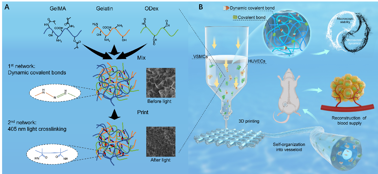 血管化是目前限制大尺寸組織工程支架構(gòu)建的關(guān)鍵問(wèn)題。盡管近年來(lái)人工血管/血管網(wǎng)絡(luò)的生物制造技術(shù)獲得了巨大的發(fā)展,但構(gòu)建具備仿生結(jié)構(gòu)以及收縮功能的血管網(wǎng)絡(luò)一直是領(lǐng)域重大挑戰(zhàn)。為解決上述問(wèn)題,研究團(tuán)隊(duì)開(kāi)發(fā)了一種具有動(dòng)態(tài)共價(jià)交聯(lián)網(wǎng)絡(luò)的仿ECM生物墨水,通過(guò)模擬ECM的適應(yīng)性微環(huán)境和結(jié)構(gòu)組分,引導(dǎo)血管內(nèi)皮細(xì)胞和血管平滑肌細(xì)胞自發(fā)排列形成具有仿生雙層結(jié)構(gòu)的血管網(wǎng)絡(luò)。